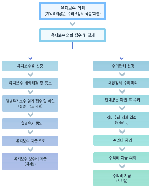 매월 수리비 회계처리는 당월말일까지 제출된 점검내역표와 세금계산서를 일괄 취합하여 다음달 초에 지출 품의한다.