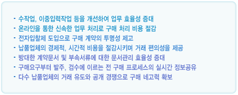 - 시스템을 통한 온라인 공고 자체처리 - 물품납품업체에 휴대폰SMS 자동공지 - 공인인증서를 이용한 입찰참여 |